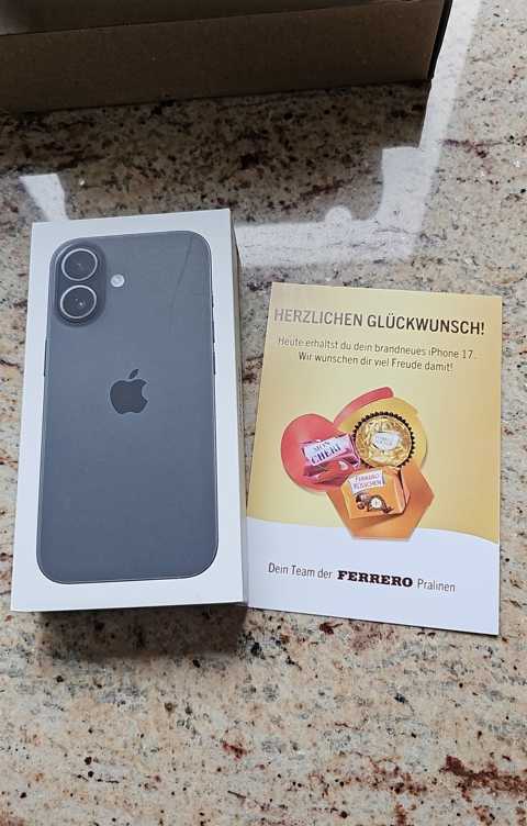 Liebes Team vom gewinnspiele-versand, auch ich möchte mich mal wieder mit einem tollen Gewinn einreihen: Und zwar habe ich bei einem Produktkauf - Gewinnspiel von Ferrero ein brandneues iPhone17 im Wert von 950 €uro gewonnen! Da ich bei diesen "Sie erfahren sofort, ob Sie gewonnen haben"-Gewinnspielen bis jetzt nie Glück hatte, habe ich mich umso mehr gefreut.